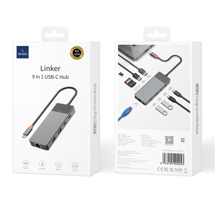 • ДизайнМодель A923RPT вирізняється сучасним та мінімалістичним дизайном, виконаним із алюмінієвого сплаву в стильному сірому кольорі. Конструкція пристрою компактна та ергономічна, що робить його зручним для повсякденного використання. На корпусі розташовано індикатор, який інформує про робочий стан адаптера, а також порт USB-C і безліч інших інтерфейсів: 2 USB 2.0, 2 USB 3.1, слоти для SD і MicroSD карт, RJ45, VGA, HDMI і порт PD для швидкого заряджання. Завдяки такій кількості роз'ємів, пристрій забезпечує універсальність і легкість підключення різних гаджетів.