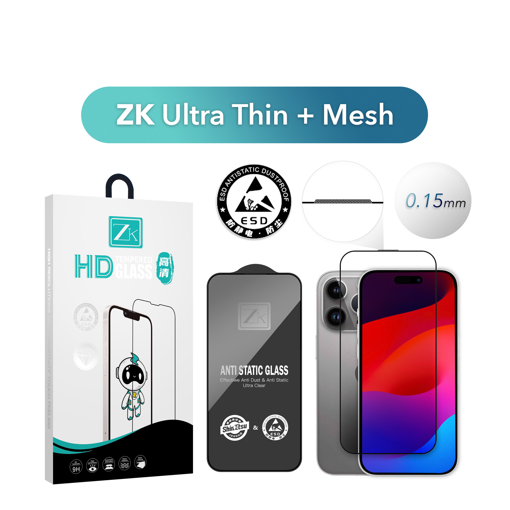 Захисне скло ZK Ultra Thin виготовлене зі сплаву, що містить молекули алюмінію, і має ультратонку товщину всього 0,15 мм, що робить його майже непомітним на екрані. Воно ефективно захищає дисплей від подряпин і механічних пошкоджень, зберігаючи природну чутливість сенсора. Олеофобне покриття забезпечує легке очищення від відбитків пальців, а зносостійкість гарантує довговічність. Завдяки високоякісним матеріалам скло має преміальну якість, що забезпечує його надійність і тривалий термін служби. Задня пластина завтовшки 0,65 мм має антистатичний ефект, що запобігає накопиченню пилу. У комплект входять волога серветка, мікрофібра та пилозбірні стікери, що полегшують процес поклейки скла.