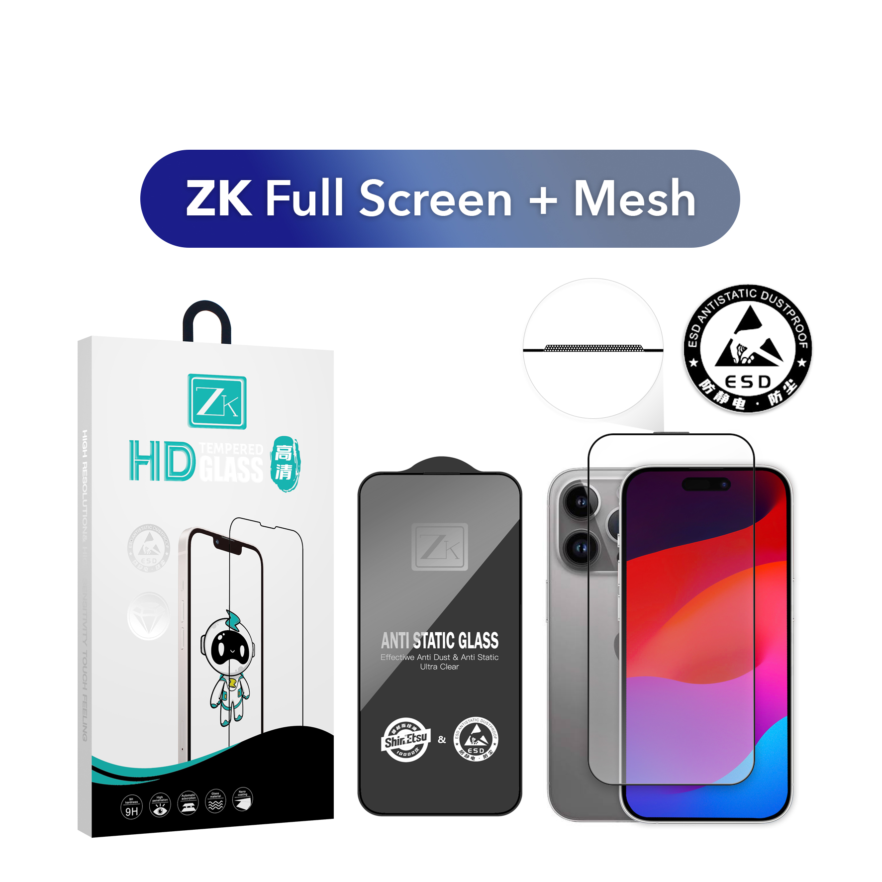 Захисне скло ZK виготовлене зі сплаву, що містить молекули алюмінію, товщиною 0,26 мм, який ефективно захищає дисплей від подряпин і механічних пошкоджень. Олеофобне покриття забезпечує легке очищення поверхні від відбитків пальців, а зносостійкість гарантує довговічність. Завдяки високоякісним матеріалам скло має преміальну якість, що забезпечує його надійність і тривалий термін служби. Задня пластина завтовшки 0,65 мм має антистатичний ефект, що запобігає накопиченню пилу. У комплект входять волога серветка, мікрофібра та пилозбірні стікери, що полегшують процес поклейки скла.